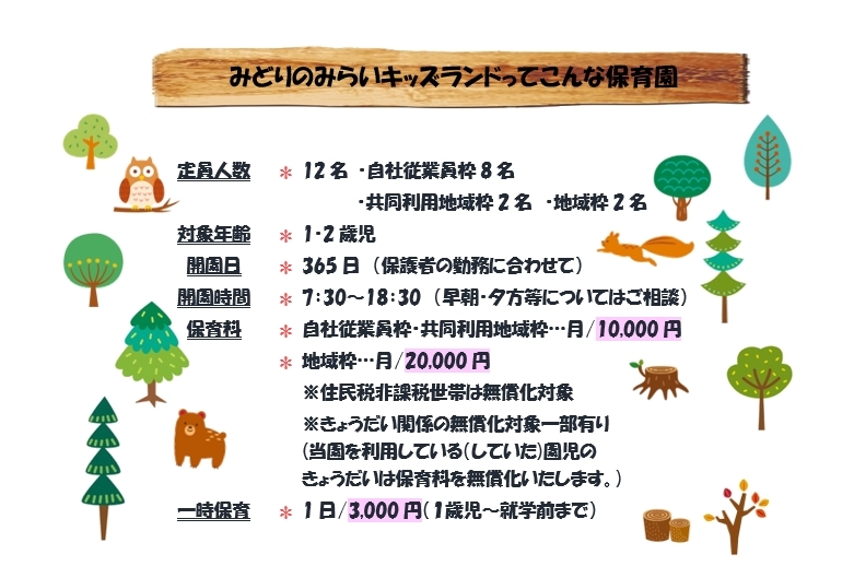 ☝画像をクリックすると、 保育園のページに移動します。 ◆令和7年度年度 1、2歳児クラス 園児募集受付中!! 企業主導型保育園に決定しておりますので、地域枠(弊社以外で働く方)のお子様の受入れも行っております。 保育料はお安くなっております。 詳しくは、上記画像をクリック!! お気軽にお問合せ下さい。 みどりのみらいキッズランド ☎0283-85-7145 |